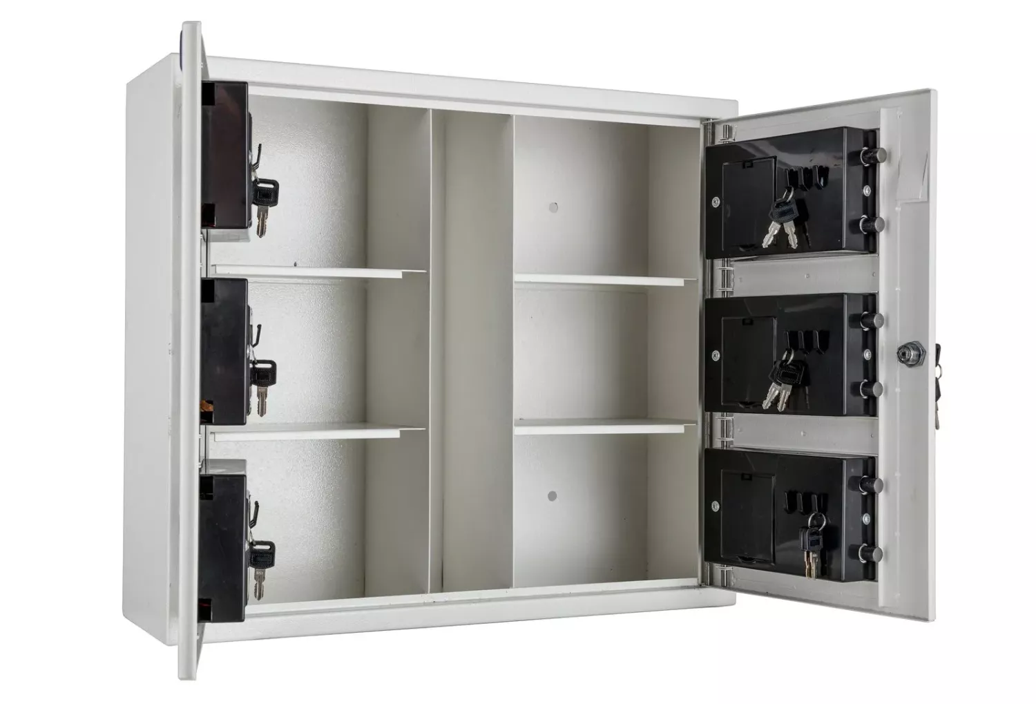 Skåpet har 6 fack och tack vare sin nätta utformning går det att placera i t.ex. klassrummet eller på kontoret. Batterier för de individuella kodlåsen bytes från utsidan.