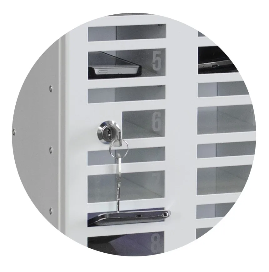 Mobilerna kan deponeras i skåpet utan att behöva låsa upp skåpet i förväg, vilket gör det snabbt och enkelt för elever att deponera mobilerna t.ex. när lektionen börjar. Genom fönstret kan eleverna själva se vilken mobil som tillhör dem. Varje fack är även numrerat vilket gör att varje elev kan få sitt eget fack.