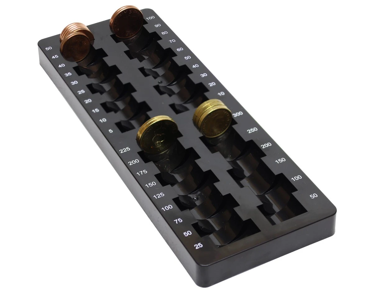 Avlång myntbricka för svenska mynt. Avlång design gör det möjligt att placera inuti kassalådor/insatslådor.