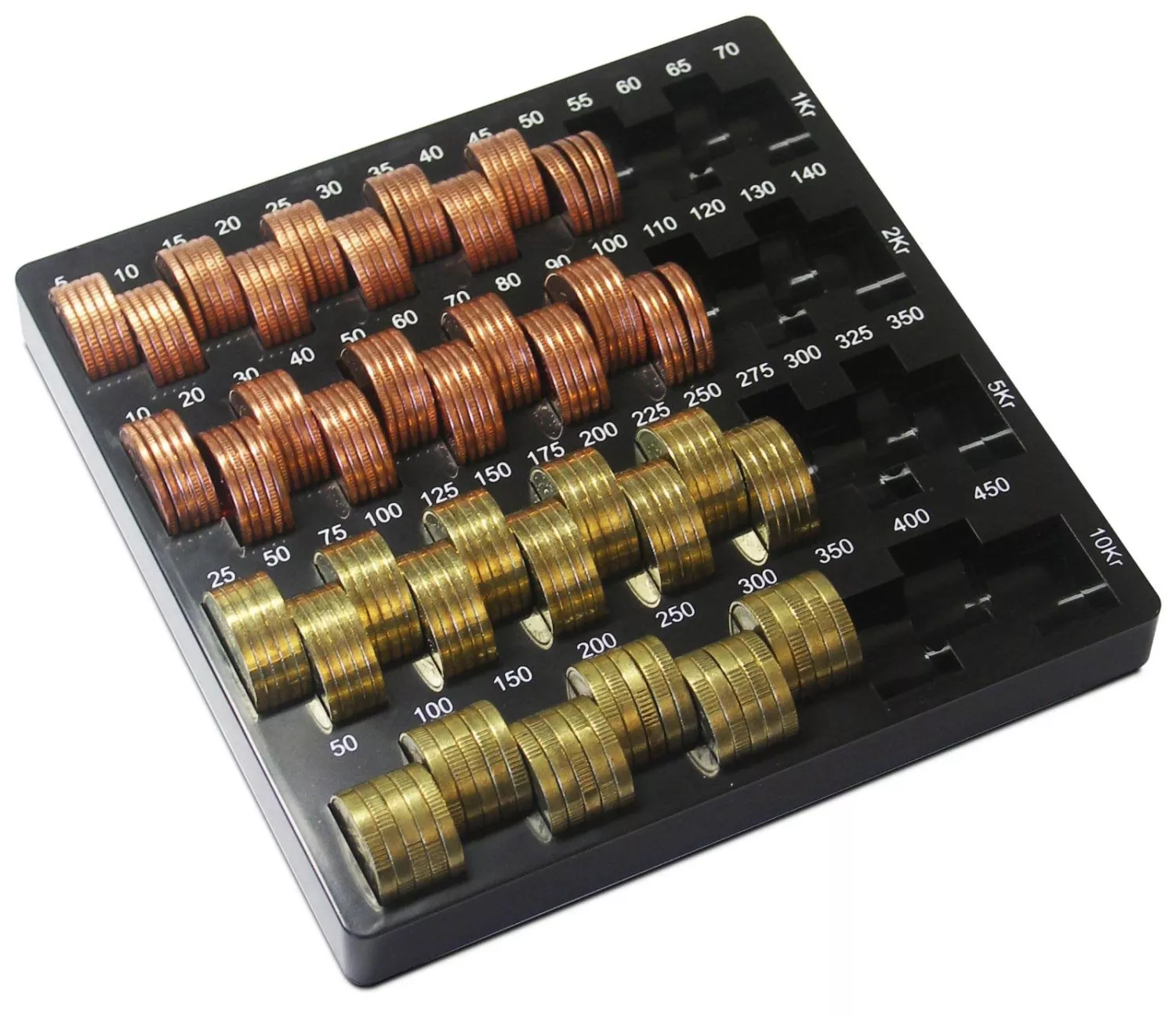 Praktisk bricka för hantering av svenska mynt. Myntbrickan är anpassad för de nya svenska mynten. Passande myntvalörer: 1 kr, 2 kr, 5 kr och 10 kr. Myntbrickan har beloppsindikator intill varje valör och är tillverkad i plast.