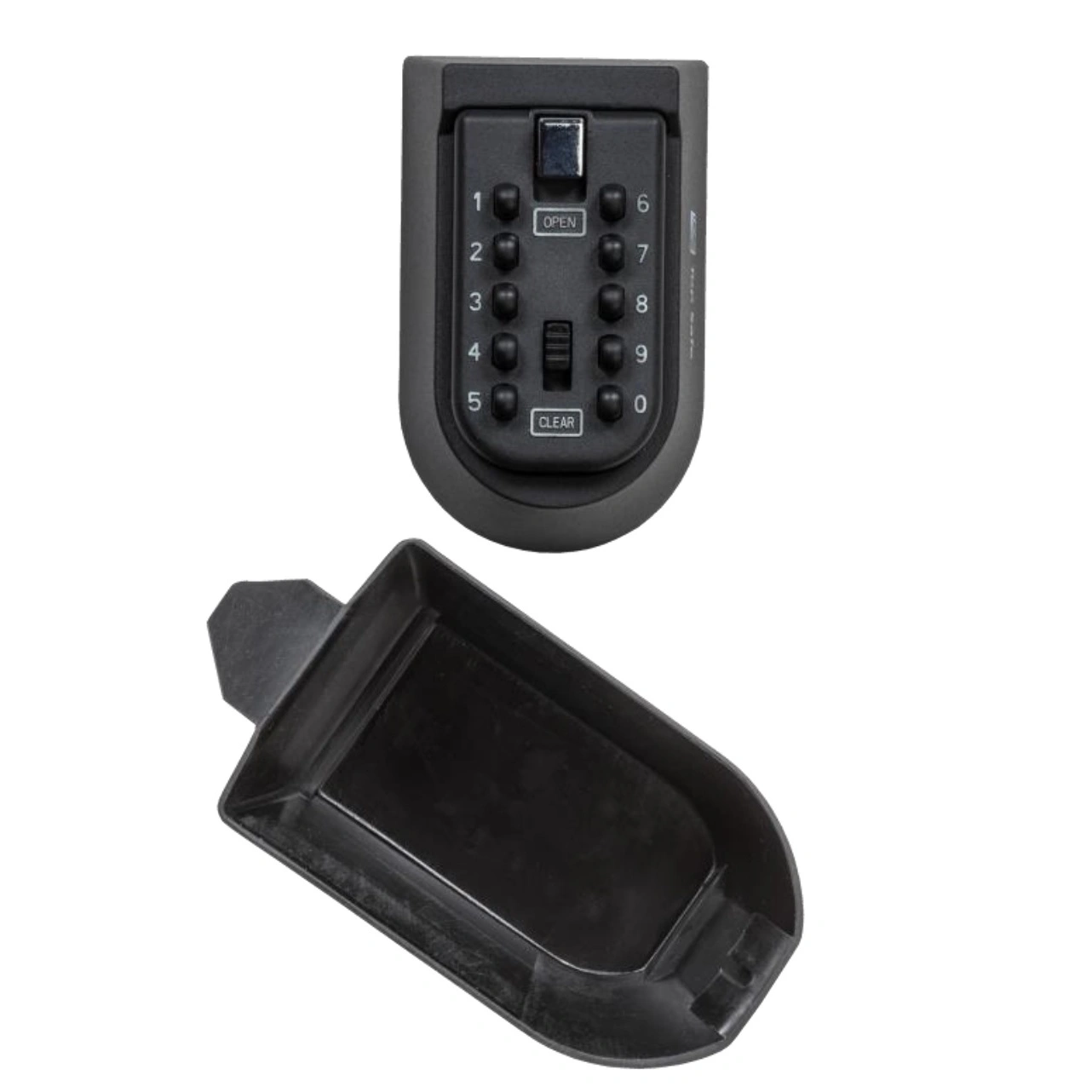 Gömman har en magnetiska nyckelhängare som bl.a. rymmer husnycklar. Väderskydd i grovt gummi medföljer vilket underlättar förvaringen i alla väderlekar, samt skruvsats för att montera gömman på vägg.