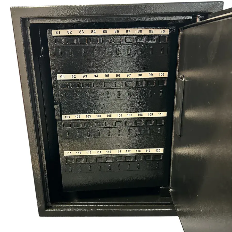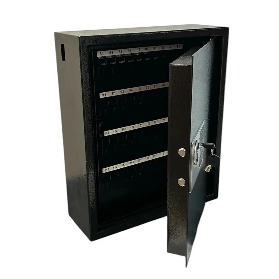 Snyggt nyckelskåp i svart strukturlack med 120 nyckelkrokar. Skåpet passar utmärkt i hemmet samt för t.ex. äldreboenden, skolor, sjukhus, hotell eller gästhus som kräver säker förvaring lite större nyckelmängder.