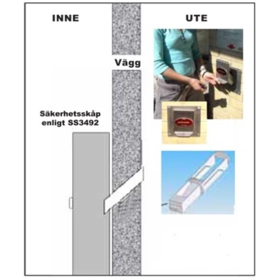 Montering: Röret kapar man i den längd man vill ha beroende på hur tjock väggen är och sedan monterar man röret i ett hål i ytterväggen som man har borrat i föväg , enligt den medföljande manualen. Röret går genom ytterväggen och sedan in i ett säkerhetsskåp på insidan av huset. Deponeringsfacket och fiskskyddet monterar men därefter på röret. Man måste göra ett hål i husets yttervägg (i 45° vinkel) samt säkerhetsskåpets baksida.