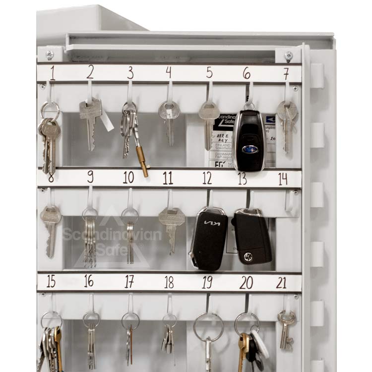 SP-111 är utrustat med 42 st nyckelkrokar för säker förvaring av bilnycklar, husnycklar och annat. Perfekt för det mindre företaget som saknar behov av ett större säkerhetsskåp.