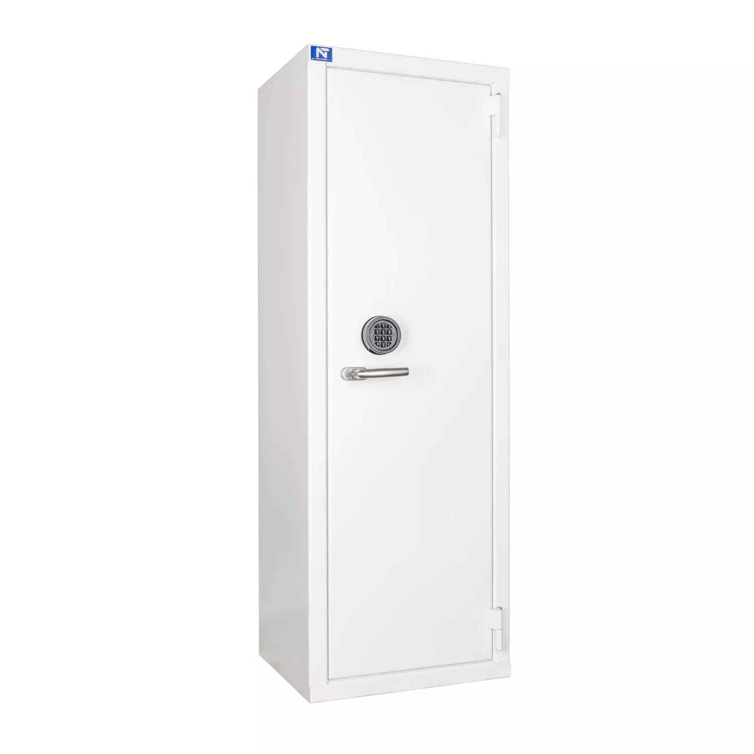 Skåpet har en mjuk, vit beläggning och en kompakt, gedigen design. Skåpdörren är robust, med 3 st horisontella och 2 st vertikala låskolvar.