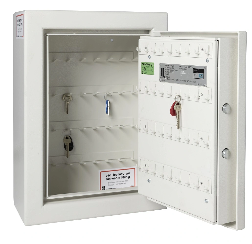 Skåpet har säkerhetsklassning SSF3492 (samma som vapenskåp) och är godkänt av försäkringsbolagen för förvaring av nycklar. Skåpet är tillverkat i 4 mm stålplåt och det finns 4 st förborrade hål i skåpets rygg för fastbultning i vägg.