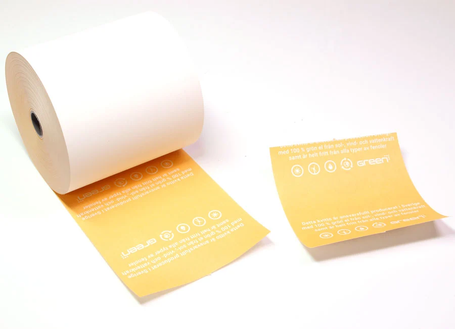 Pappret är fritt från fenol och bisfenol, och är tillverkat i Sverige. Printsidan är vit och baksidan är färgad med ett miljöbudskap: "Detta kvitto är ansvarsfullt producerat i Sverige med 100% grön el från sol-, vind- och vattenkraft samt är helt fritt från alla typer av fenoler."