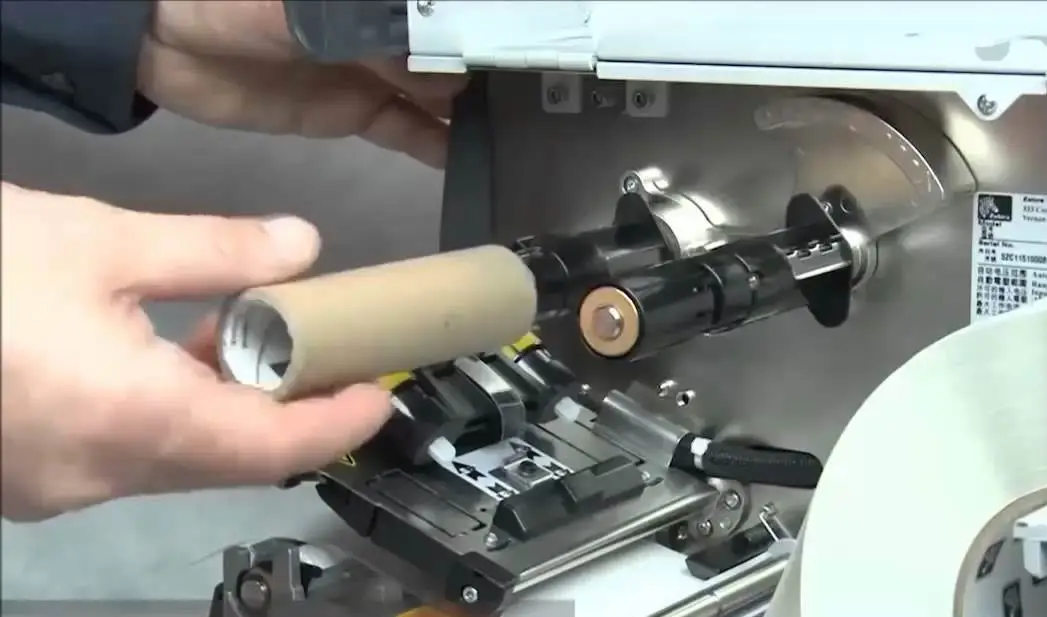 Tomhylsa för upprullning av färgband i etikettskrivare. Tom färgbandsspole i papp. Monteras på en hållare i skrivaren, för att sedan dra färgbandet runt spolen.
