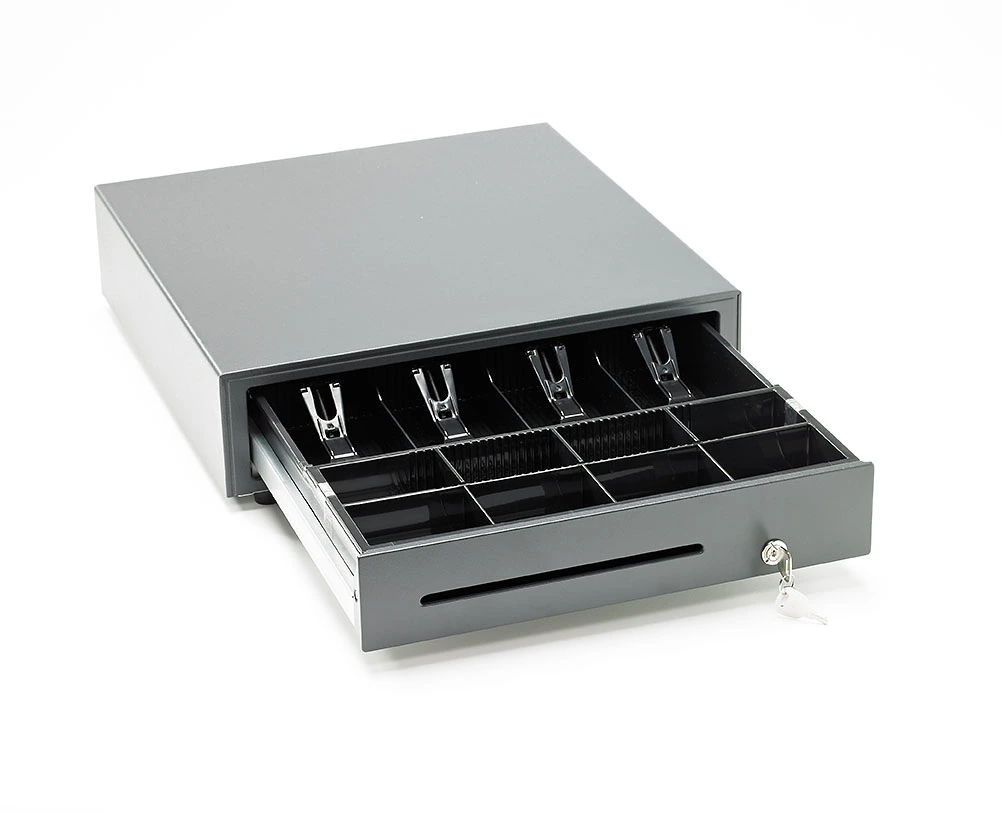 - Kassalåda (fyra fack för sedlar, åtta fack för mynt).
