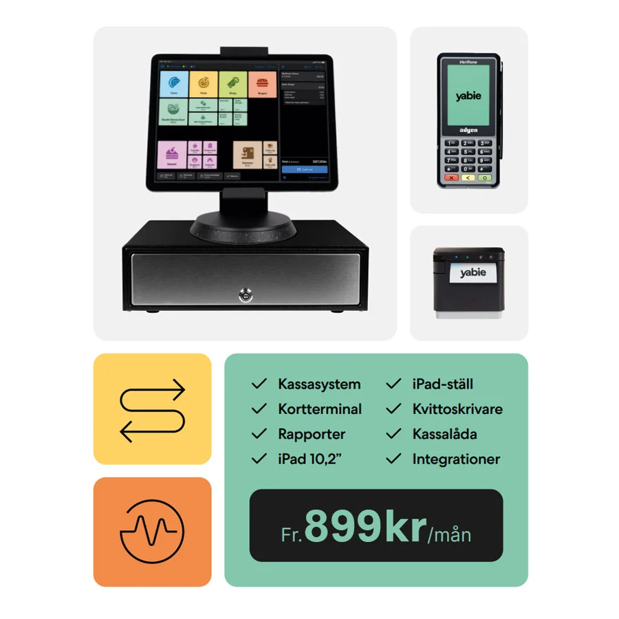 All-i-ett-paket: Yabie Express-paketet innehåller kortterminal, iPad 10,2", iPad-ställ, Yabie POS-licens, kvittoskrivare, 24/7 support, Yabie Backstage för omfattande verksamhetskontroll, samt en pålitlig kassalåda