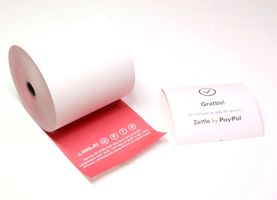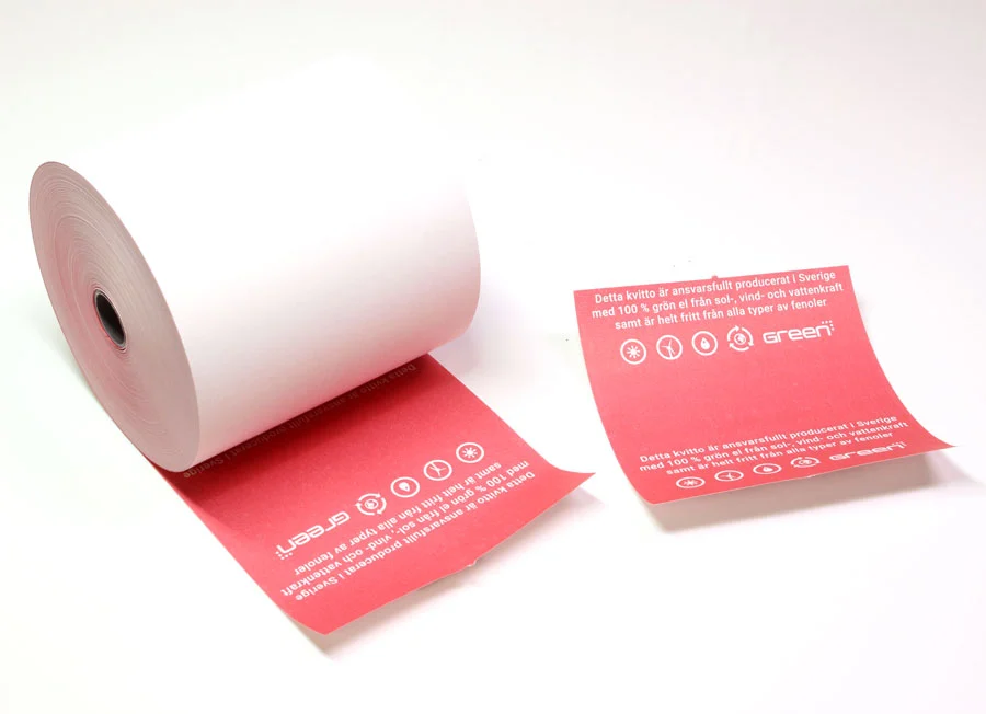 Pappret är fritt från fenol och bisfenol, och är tillverkat i Sverige. Printsidan är vit och baksidan är färgad med ett miljöbudskap: "Detta kvitto är ansvarsfullt producerat i Sverige med 100% grön el från sol-, vind- och vattenkraft samt är helt fritt från alla typer av fenoler."
