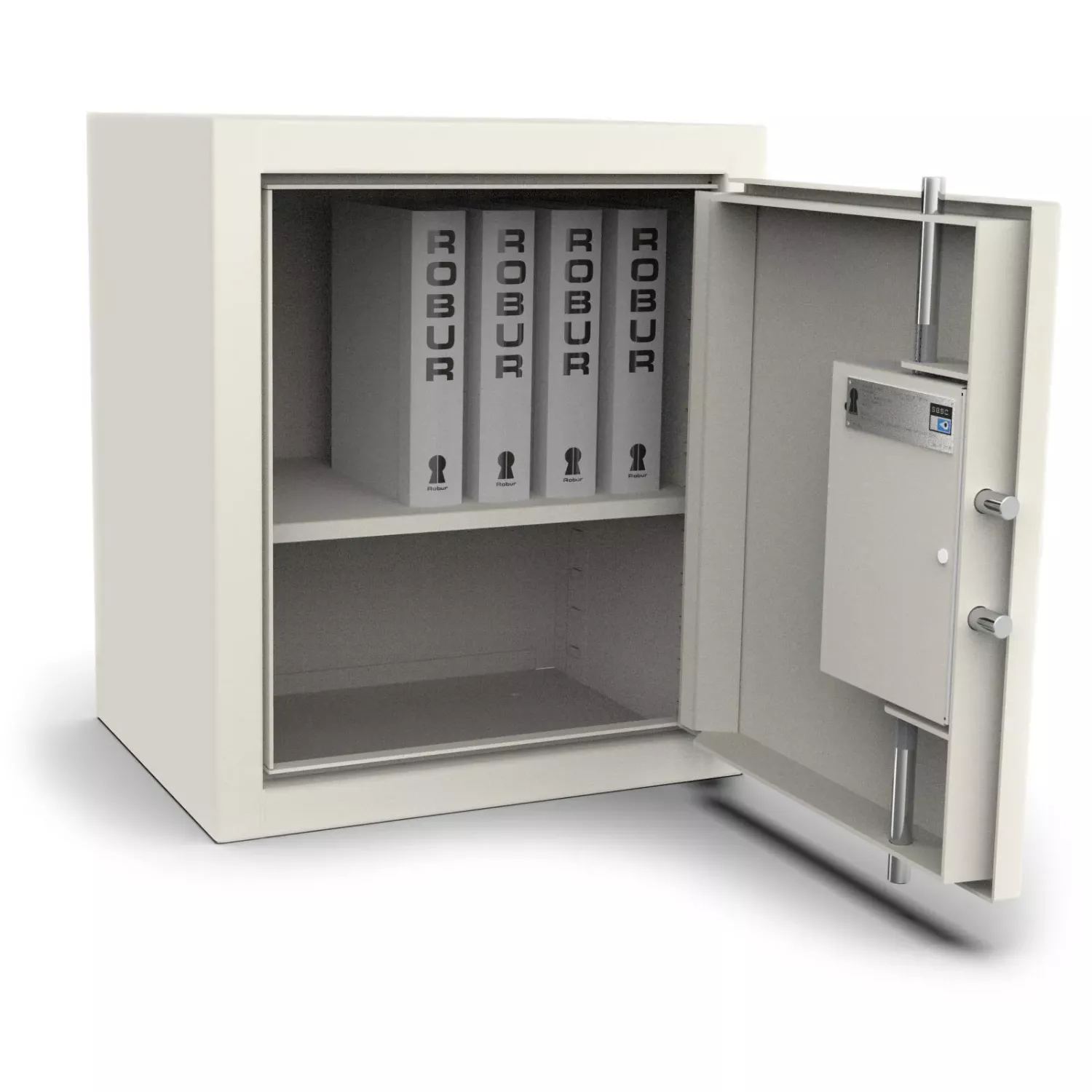RSK 700 är det näst minsta säkerhetsskåpet ur RSK-serien. Helsvetsad stålkonstruktion med 1 dörr. All inredning är flyttbar på var 50:e mm i höjdled. Levereras med förborrade hål för fastbultning i golv. Låssystemet säkrar dörrarna i stängt läge oberoende av gångjärnen. Standardutrustat med omställbart nyckellås. Elektroniskt kodlås beställs separat. Beläggning av ljusgrå strukturlack.