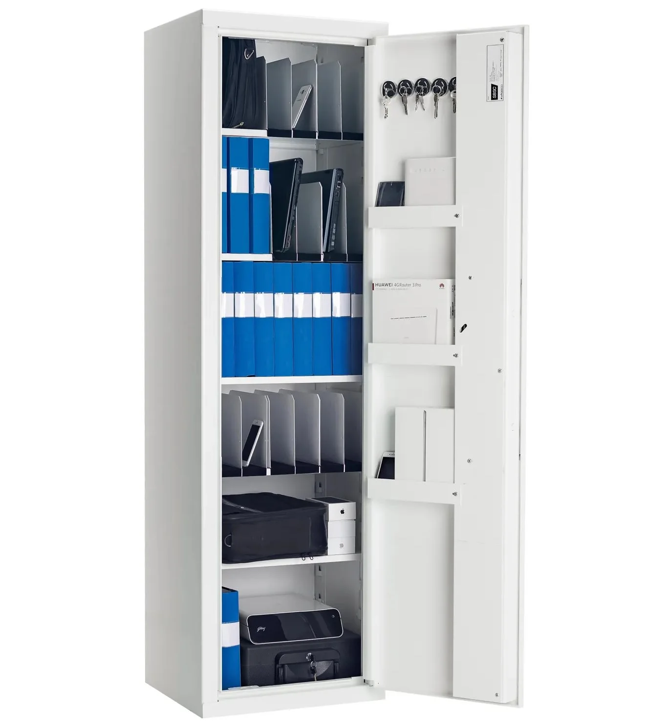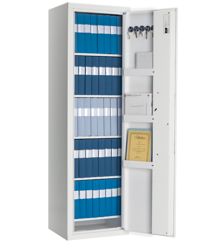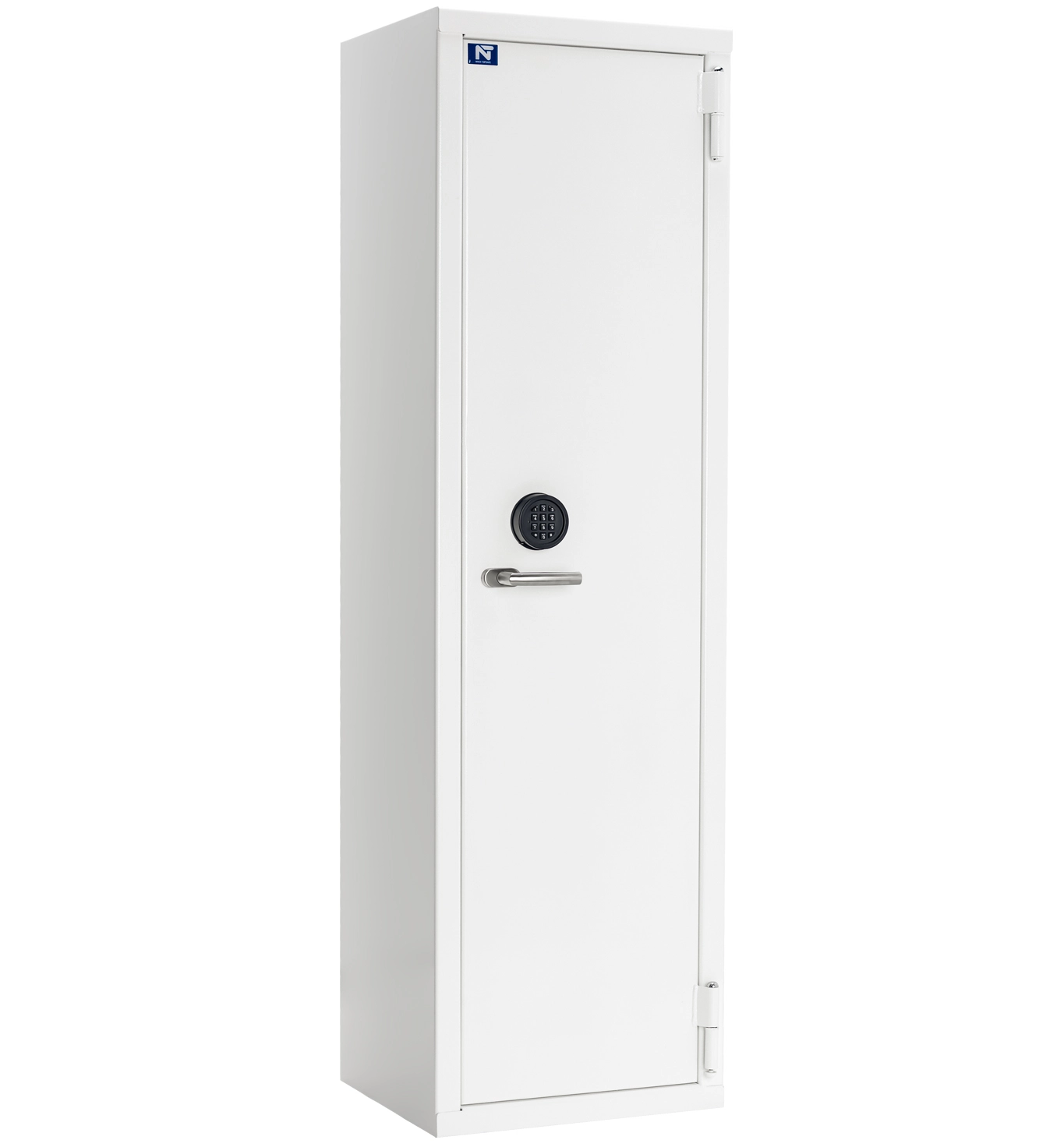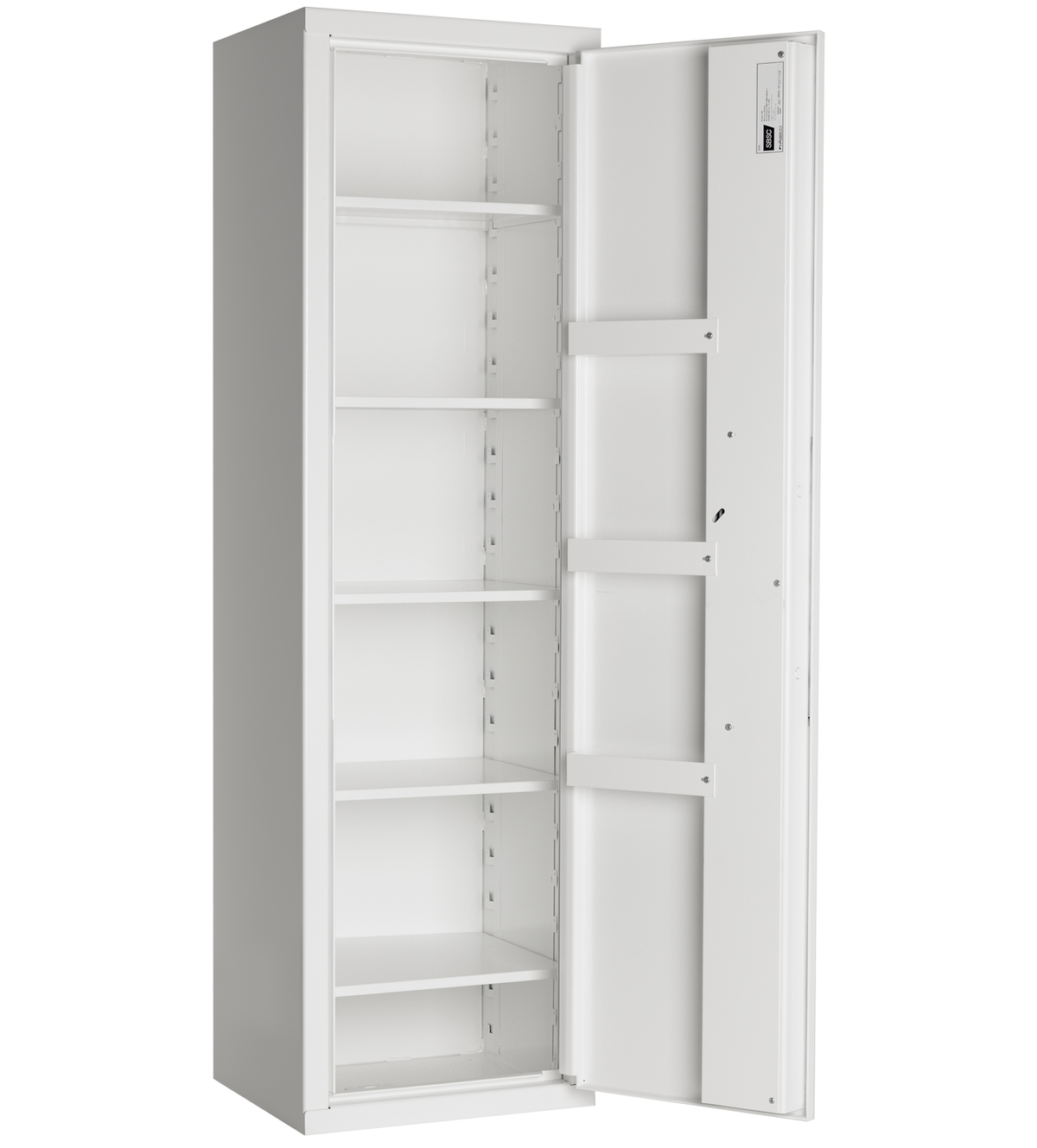Högt och rymligt säkerhetsskåp från en omtyckt skåpserie. Skåpet har tillgång till en rad tillbehör, bl.a. nyckelkassetter, nyckellister, dörrboxar, laptopstöd, hängmappsramar, småfacksmoduler och annat (se tillbehör nedan). Skåpet är dessutom säkerhetsklassat enligt den svenska standarden SSF 3492, för förvaring av värden upp till 40 000 kr, så länge du konsulterat ditt försäkringsbolag och skåpet är bultat i golv/vägg. Skåpet är tack vare sin längd även populärt som vapenskåp för jaktgevär och tillbehör.