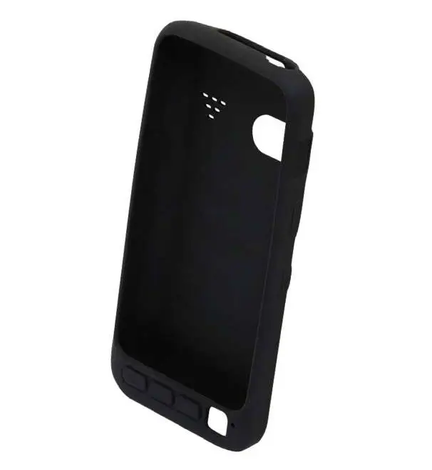 Gummiskyddet har öppningar för kamera, fingeravtrycksläsare, streckkodsläsare, av-/på-knapp, samt fysiska gummiknappar för handdatorns specialknappar F1, F2 och hemknappen.
