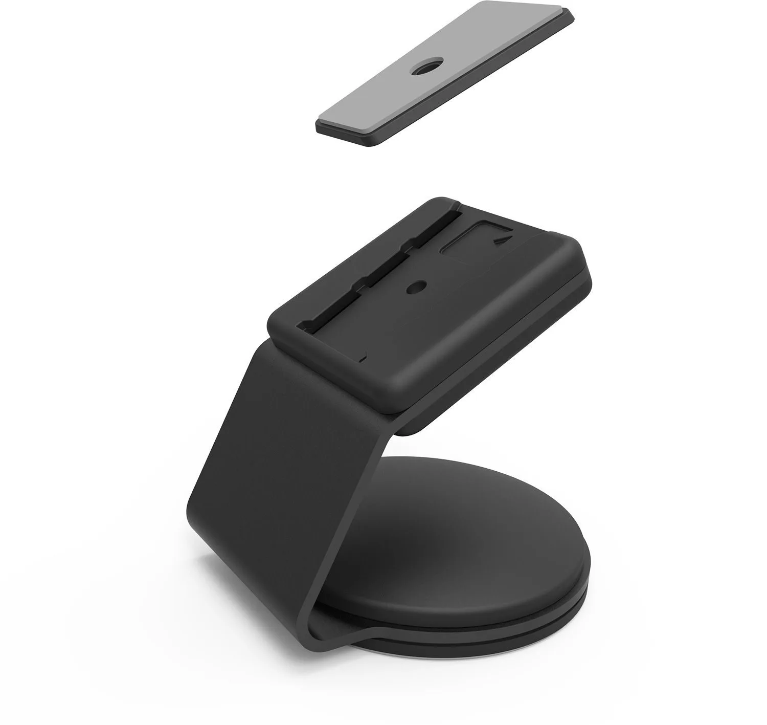 Basplattan är snurrbar i 360° och går att fästa i kassadisken direkt med klister (3M VHB, medföljer) eller genom att skruva fast den.
