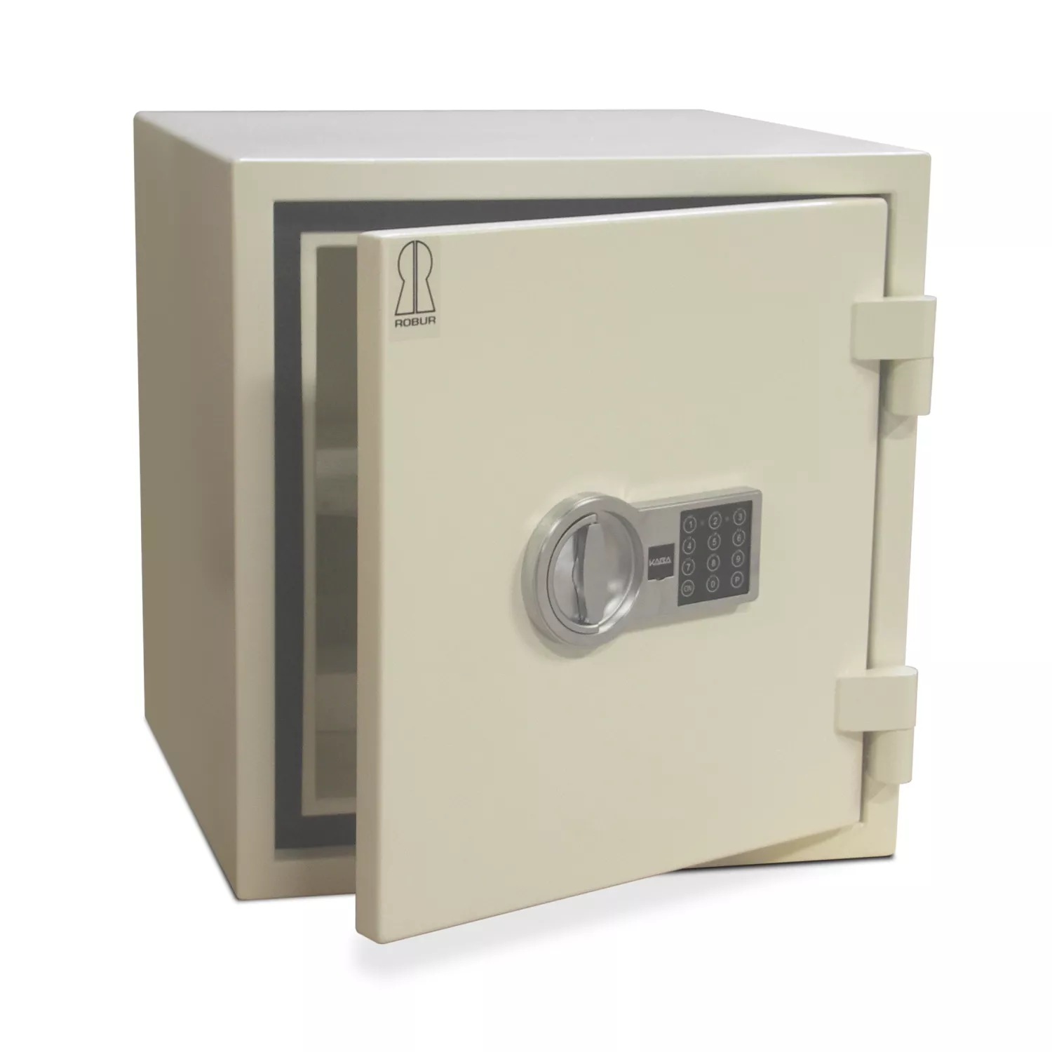 Lämpligt till att skydda dokument och värdesaker mot brand och inbrott. Väggarna är fyllda med brandisolerande specialbetong. Tre kraftiga låskolvar, dörren låses automatiskt när den stängs. Borrskyddade lås. Förborrade hål för fastbultning i golv.