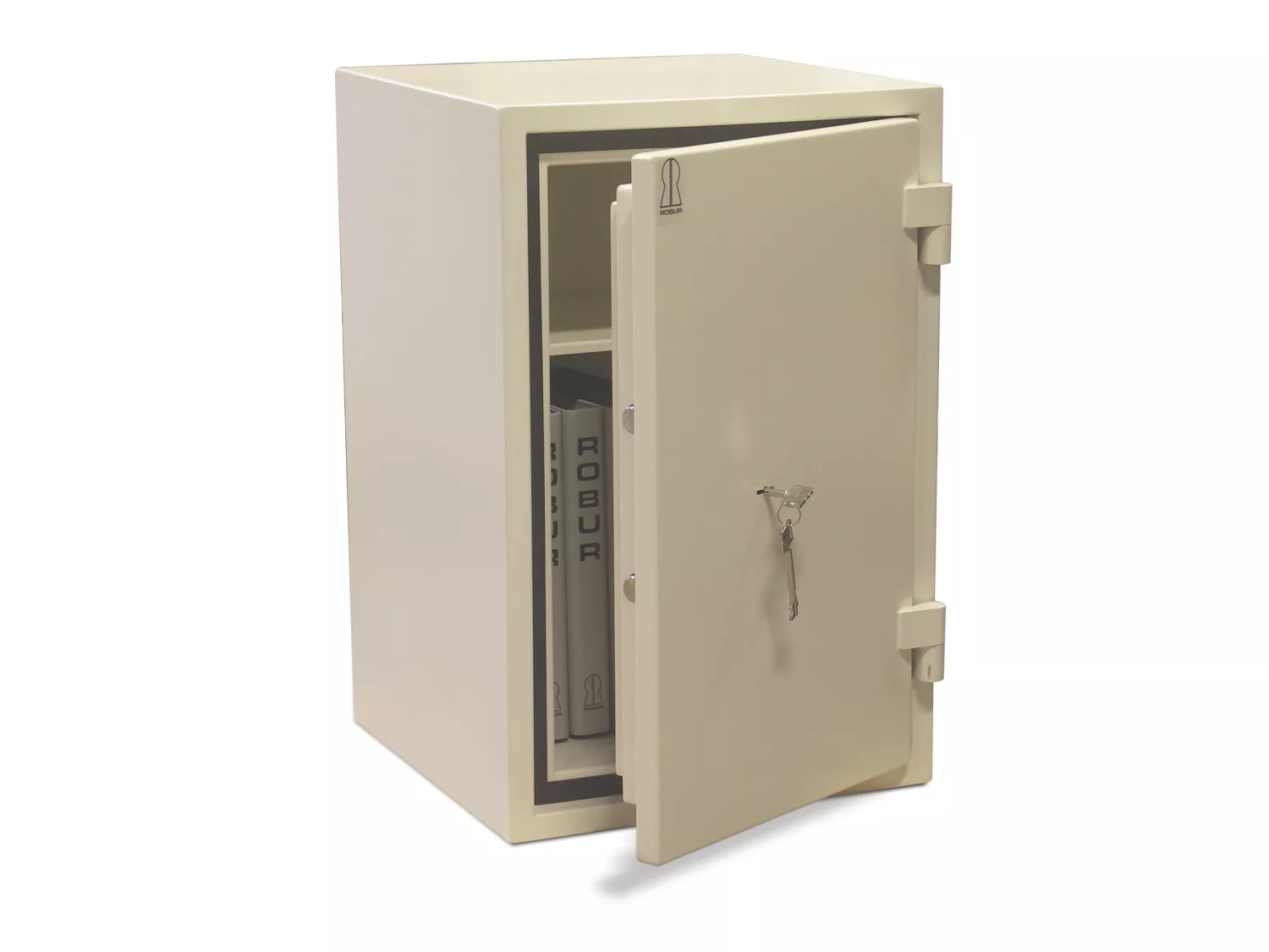 Lämpligt till att skydda dokument och värdesaker mot brand och inbrott. Väggarna är fyllda med brandisolerande specialbetong. Tre kraftiga låskolvar, dörren låses automatiskt när den stängs. Borrskyddade lås. Förborrade hål för fastbultning i golv.