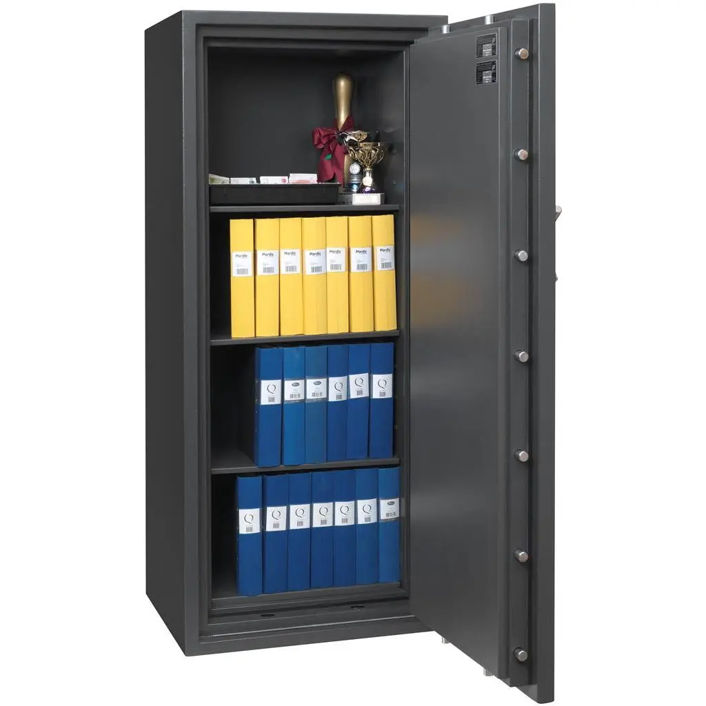 Skåpet är mycket rymligt, och du kan enkelt förvara en större mängd värdesaker, pärmar och annat. Skåpet rymmer 32+ st stående A4-pärmar. Stöldskyddet är mycket starkt, och tack vare inbyggt brandskydd för pappersdokument i upp till 1 timme är skåpet ett utmärkt alternativ för den som behöver ett robust stöldskydd i kombination med ett bra brandskydd.