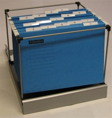 Utdragbar, kullagrad hängmappsram som fästes på hyllplan med dubbelhäftande tejp eller plåtskruv. Ramen är helt utdragbar för att lätt komma åt alla mappar.