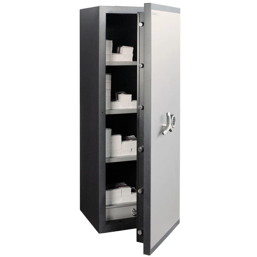 Det största värdeskåpet ur DG-serien, med certifieringen Grade 1 enligt EN-1143-1, för säker förvaring av dina värdeföremål och kontanter. Du får också 60 minuters certifierat brandskydd. Skåpet är stort och rymligt, och inrett med 4 hyllplan.