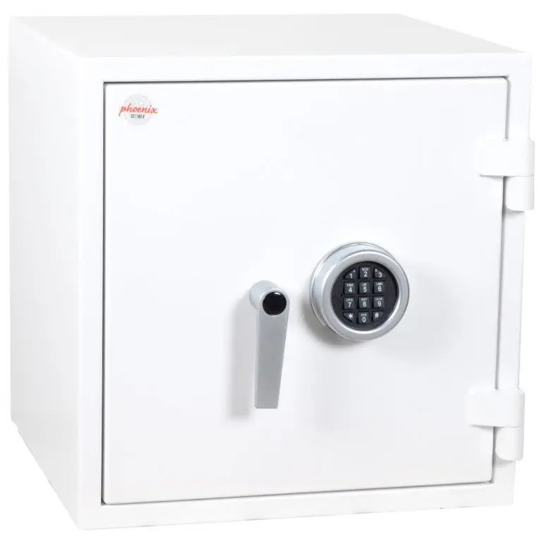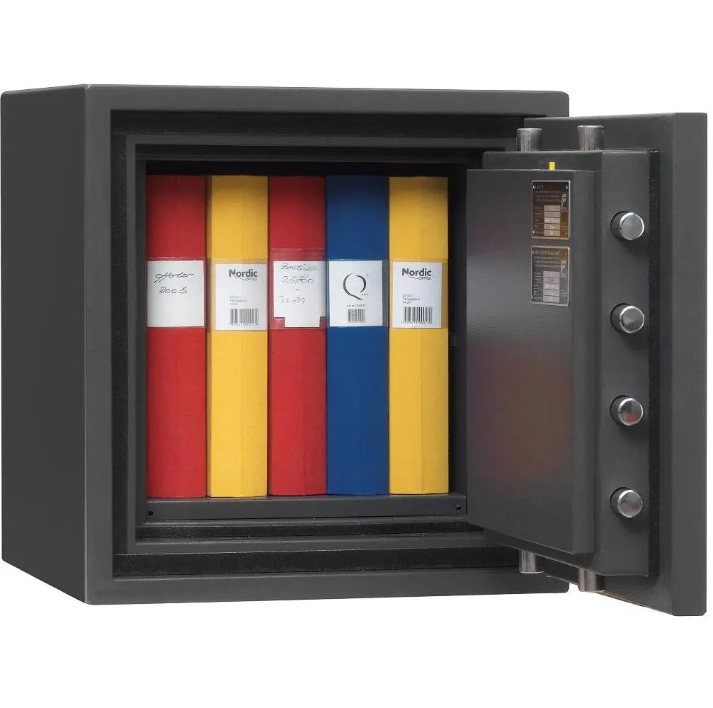 Skåpet är brett nog att rymma t.ex. en mindre bärbar dator. Om hyllplanet tas bort rymmer skåpet 5 st stående A4-pärmar. Stöldskyddet är mycket starkt, och tack vare inbyggt brandskydd för pappersdokument i upp till 1 timme är skåpet ett utmärkt alternativ för den som behöver ett robust stöldskydd i kombination med ett bra brandskydd.