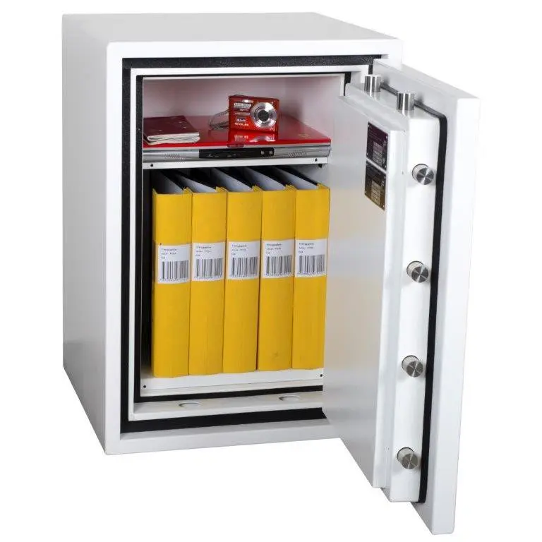 Skåpet är brett nog att rymma t.ex. en mindre bärbar dator. Skåpet rymmer 5 st stående A4-pärmar även när hyllplanet är monterat. Stöldskyddet är mycket starkt, och tack vare inbyggt brandskydd för pappersdokument i upp till 1 timme är skåpet ett utmärkt alternativ för den som behöver ett robust stöldskydd i kombination med ett bra brandskydd.