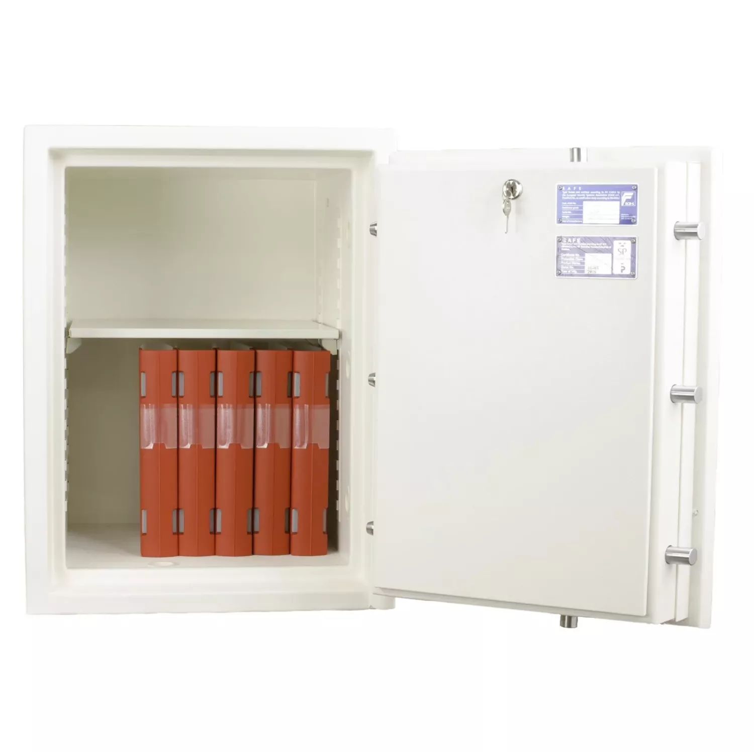 Skåpet har en klassisk kassaskåpsutformning i vit pulverlack, stadigt handtag på framsidan, och inredning bestående av 1 hyllplan. Skåpet rymmer ca. 7-8 pärmar i bredd.