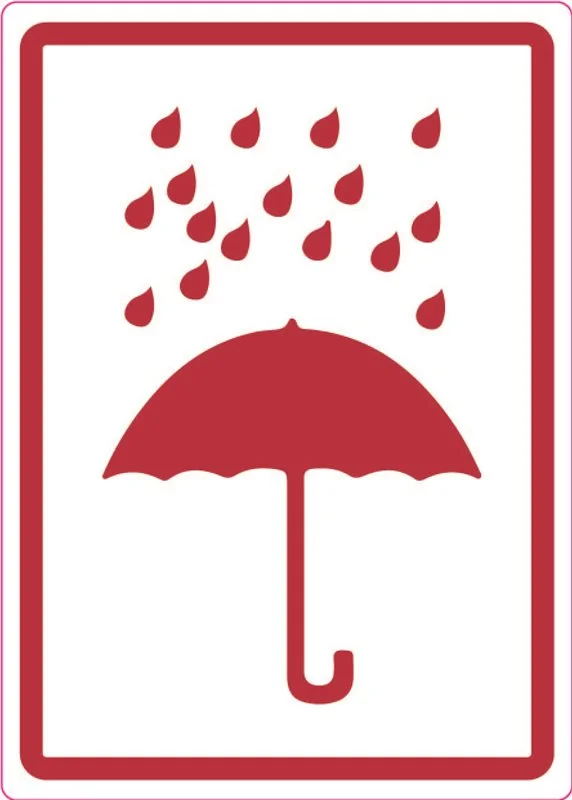 Varningsetikett med paraply. Mått: 105x74 mm. Färg: Vit och röd. Antal: 500 st per rulle.