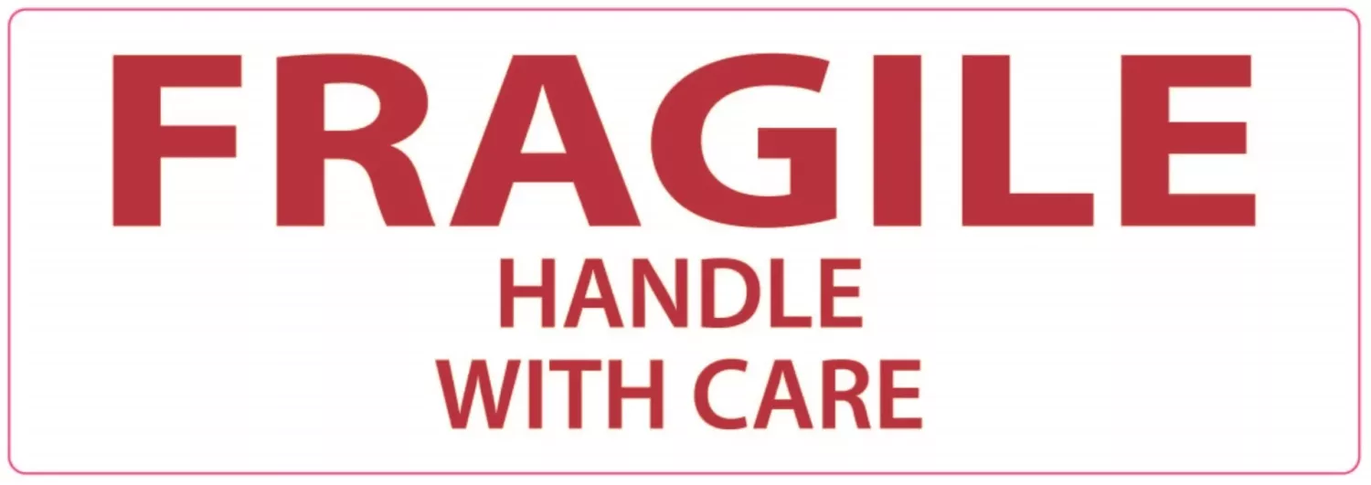 Etikettrulle med vita klisteretiketter med texten "Fragile, handle with care". Kan användas i internationella sammanhang.