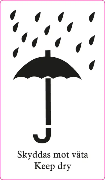 Etikettrulle med vita etiketter med paraplysymbol, texten "Skyddas mot väta" på svenska, samt "Keep dry" på engelska.